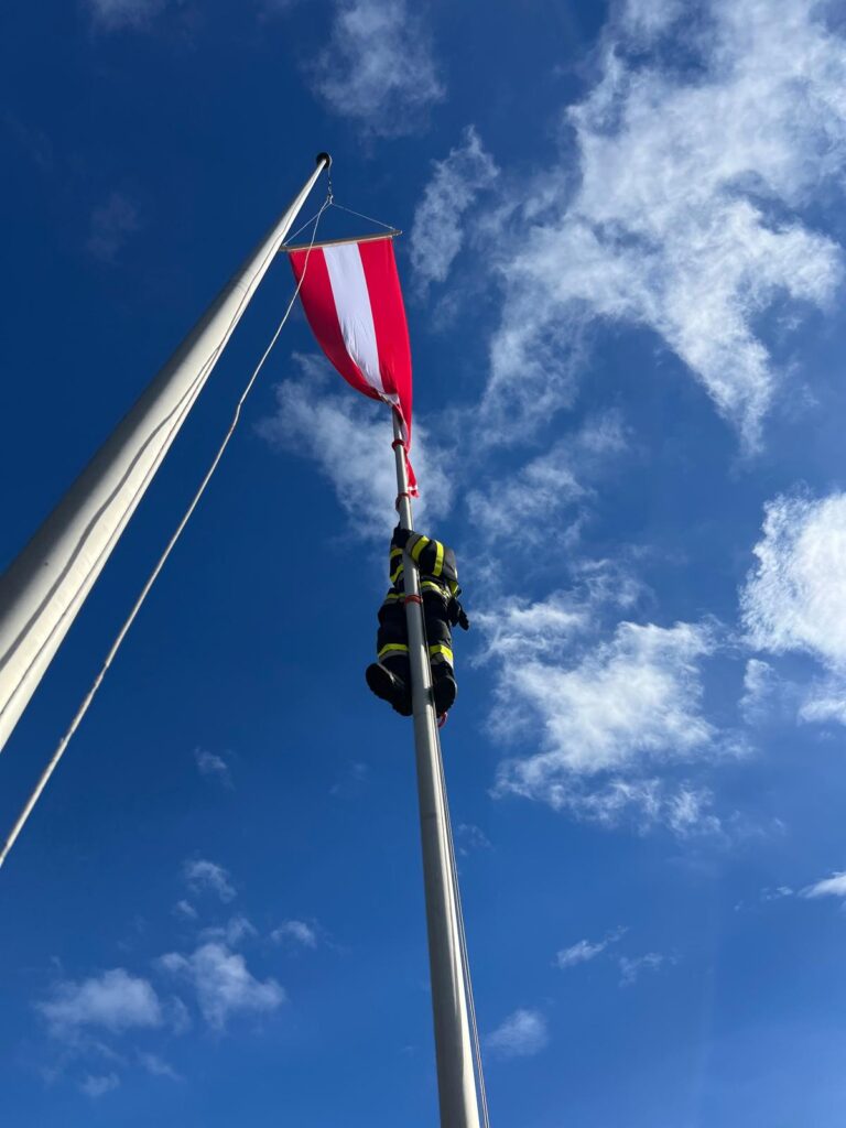 Benjamin Schletz griff beherzt ein und stieg mit Höhenrettertechnik auf den Mast, um die Fahne wieder in eine würdige Position zu bringen.