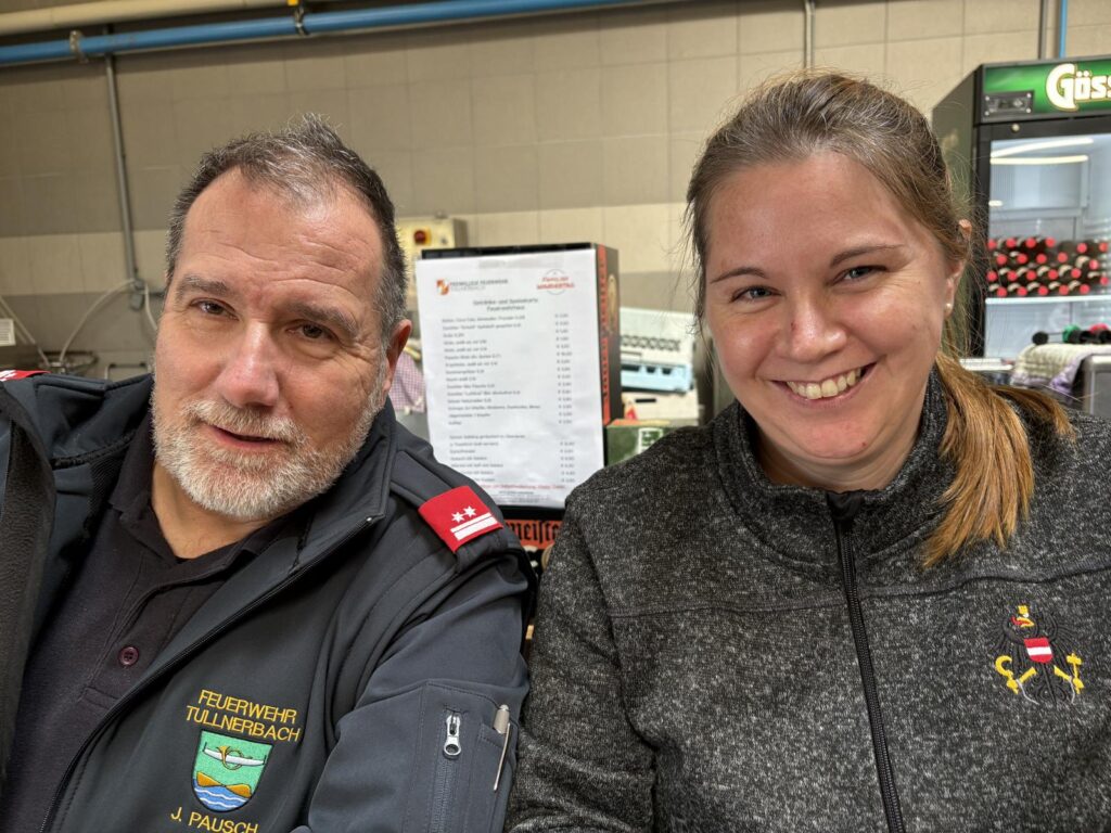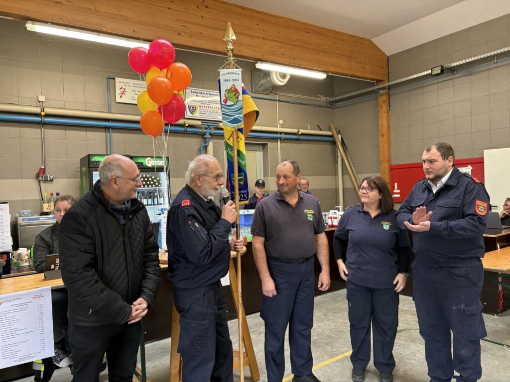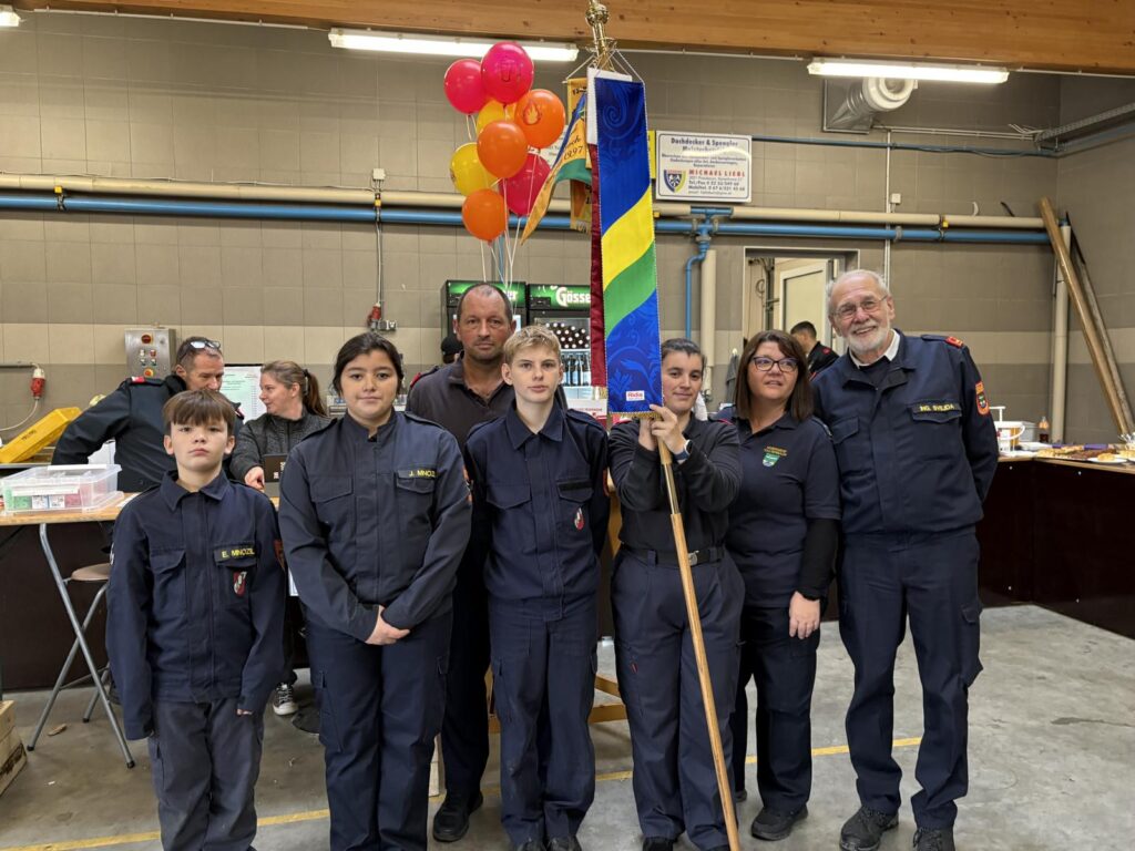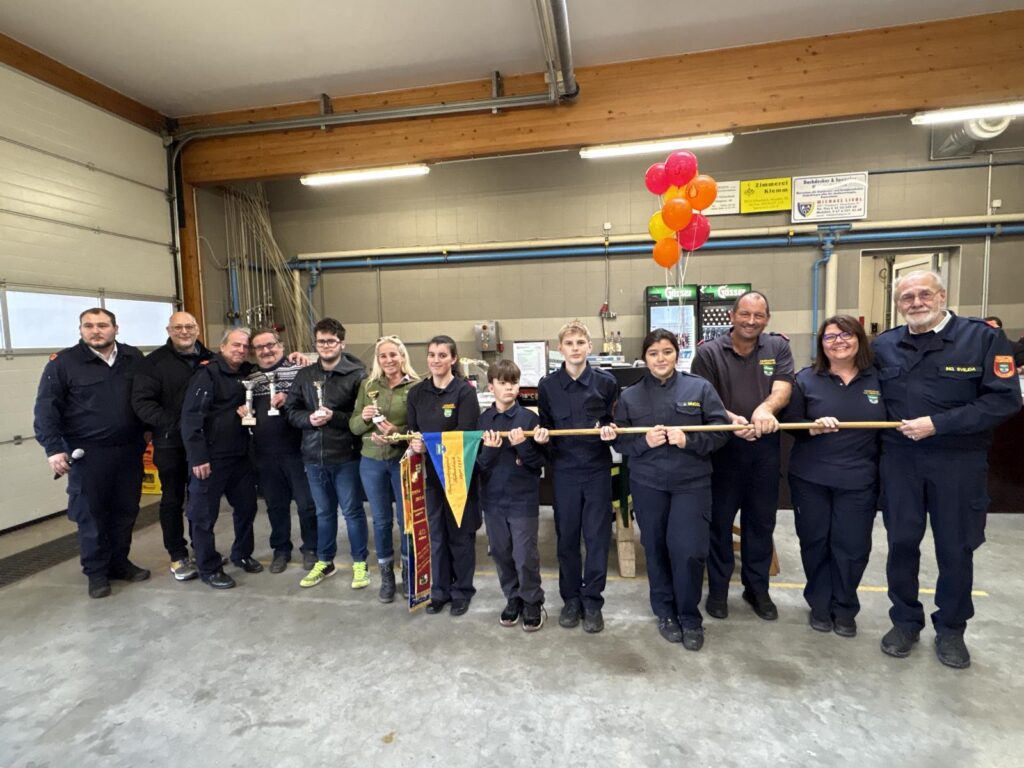 Verwalterin Karin Aulinger und Ehrenkommandant Heinrich Svejda übergaben Jugendbetreuer Ewald Steinmair eine neue Fahne – ein würdiges Geschenk, ermöglicht durch die großzügige Unterstützung dieser beiden Sponsoren.