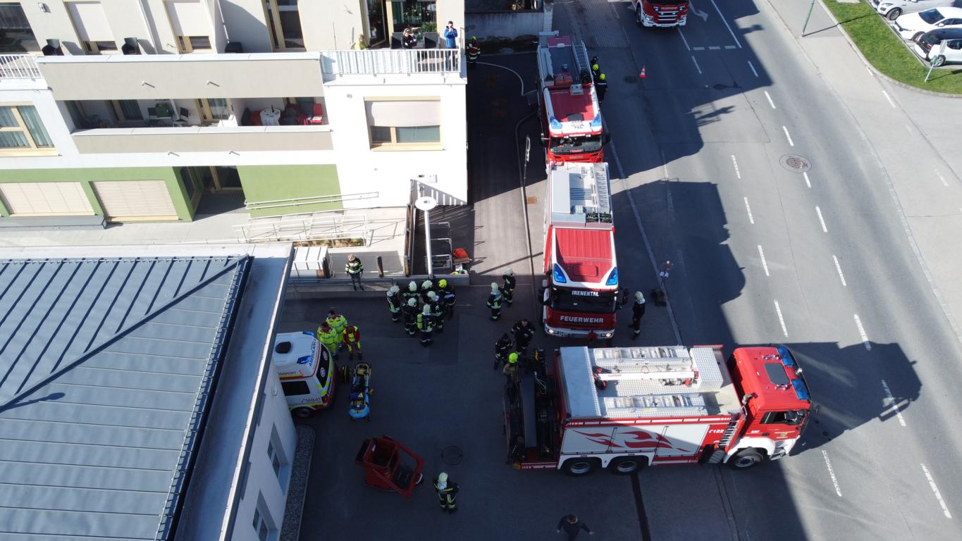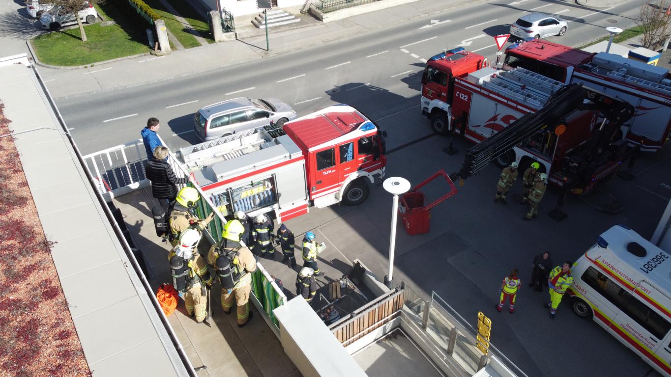 Angenommen wurde ein Unfall in der Tiefgarage bei der eine Person unter einem PKW eingeklemmt wurde, in weiterer Folge entwickelte sich ein Brand mit starker Rauchentwicklung – 2 weitere Personen befanden sich aufgrund des Rauches bewusstlos in einem PKW.