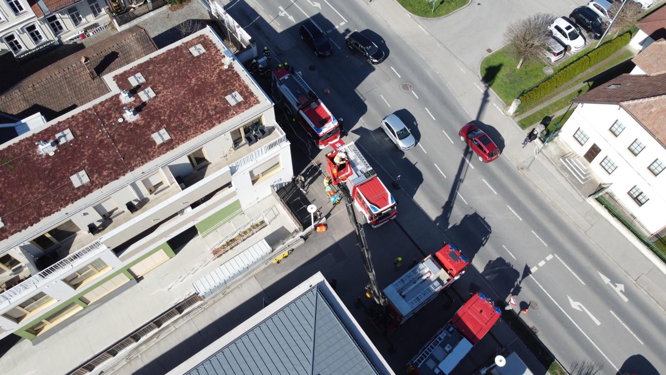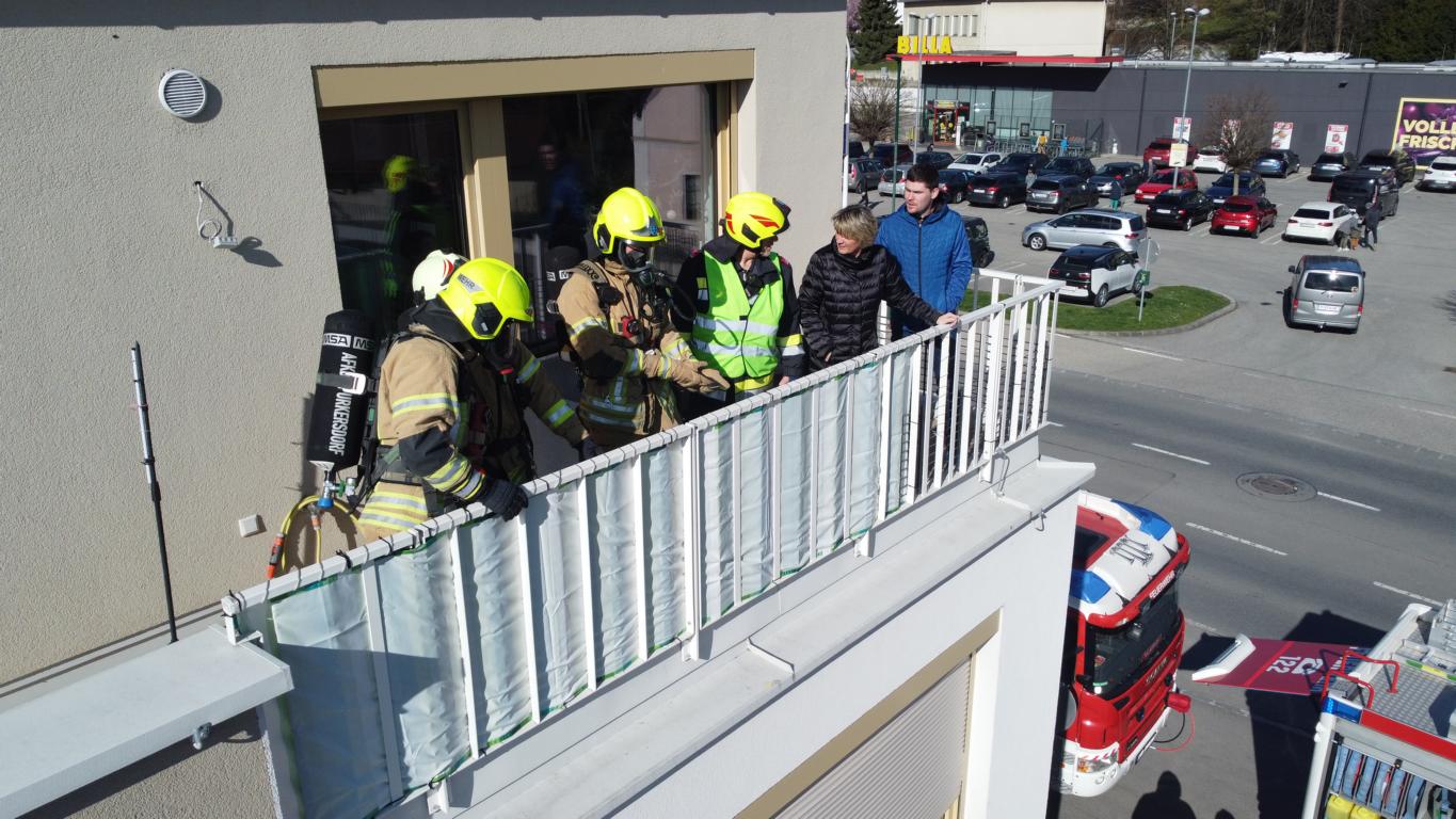 Gleichzeitig begaben sich weitere Atemschutztrupps auf die Suche nach vermissten Personen im verrauchten Stiegenhaus. 2 Bewohner konnten aufgrund der starken Rauchentwicklung schließlich nur mittels Rettungskorb des Schweren Rüstfahrzeuges der FF-Pressbaum vom Balkon einer Dachgeschosswohnung gerettet werden.