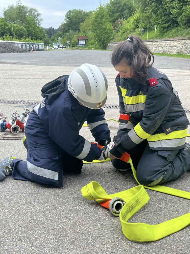 Die Jugendlichen bauten den Löschangriff mehrfach auf und vertieften so Schritt für Schritt ihr Verständnis. Im Anschluss wurde – sehr zur Freude des Feuerwehrnachwuchses – auch mit Wasser realitätsnah geübt.