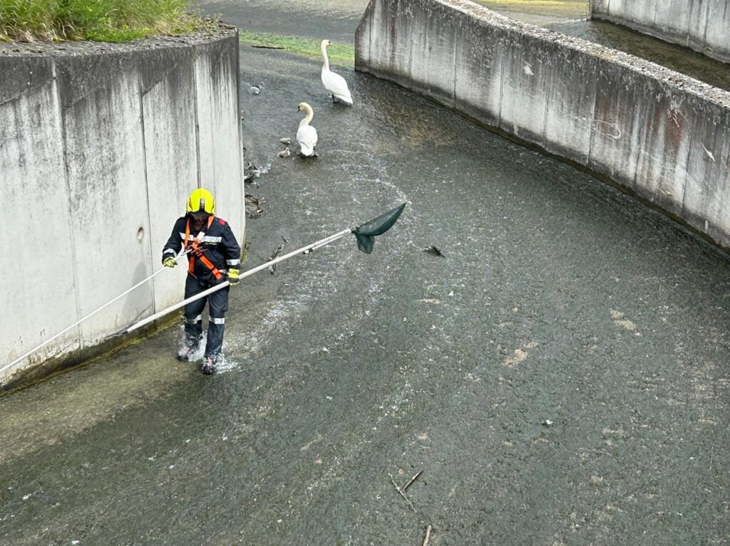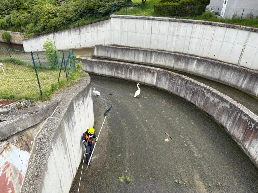 Nach Sicherung mittels Rettungsleine und Klettergurt stieg ein Kamerad den Wasserweg hinab und trieb die Schwaneneltern und die Küken in sicheres Gewässer.